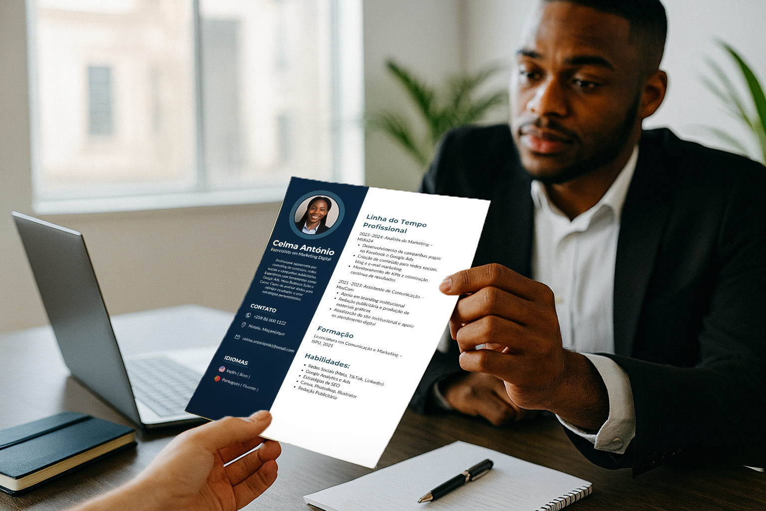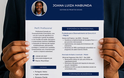 Actualizamos CVs antigos, melhoramos a apresentação, corrigimos erros e organizamos as informações para que o seu perfil fique profissional e alinhado com o mercado actual.